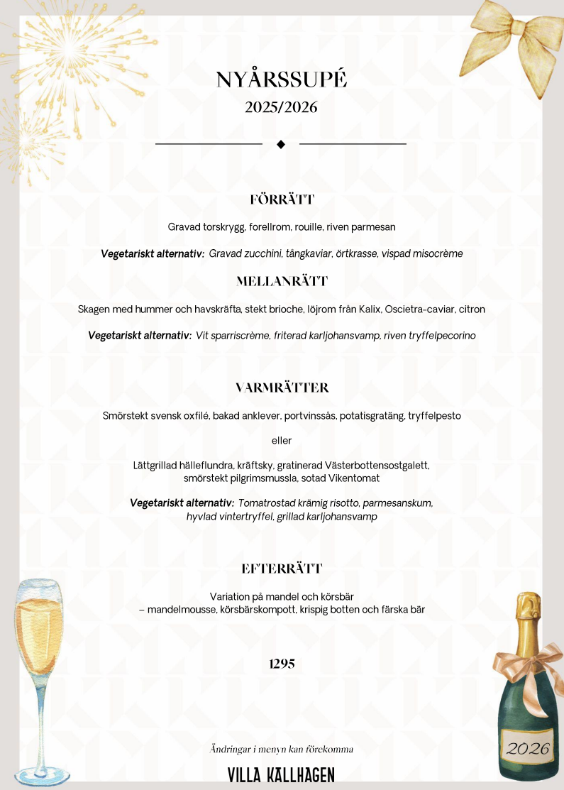 Kvällen inleds med en exklusiv nyårssupé där varje rätt är en kulinarisk höjdpunkt, skapad med kärlek och omsorg av våra erfarna kockar. Många gäster väljer att åka in till centrala Stockholm efter middagen för att se fyrverkerierna, men du kan också njuta av utsikten från vår terrass över Djurgårdsbrunnskanalen och Nordiska museet. Här samlas vi för att skåla in 2026 och njuta av fyrverkerierna från en av Stockholms bästa vyer.